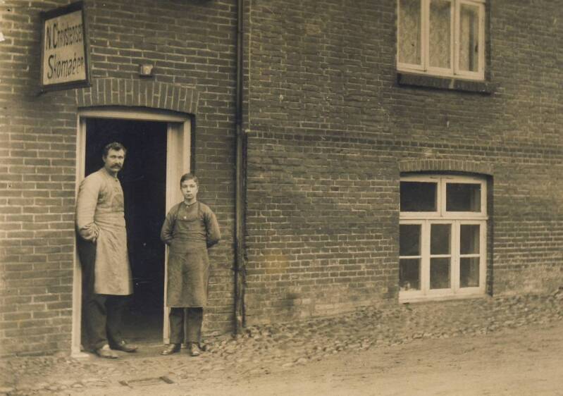 Skomagermester A. Christensen, Bryggergade 7, med lærlingen foran indgangen til værkstedet