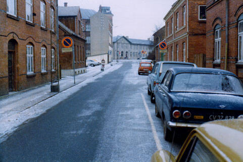Her de samme huse, set oppe fra svinget, hvor Bryggergade gik ud til Søndergade.